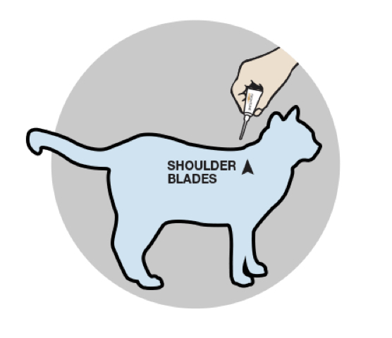POSITION the Dispensing Tip on Cat’s Back between the shoulder blades. Use dispensing tip of the tube to part cat’s hair so that the product will be applied at skin level. Squeeze applicator, applying entire contents in a single spot on the cat’s skin. Separate the treated cat from other pets for 24 hours after treatment has been applied.